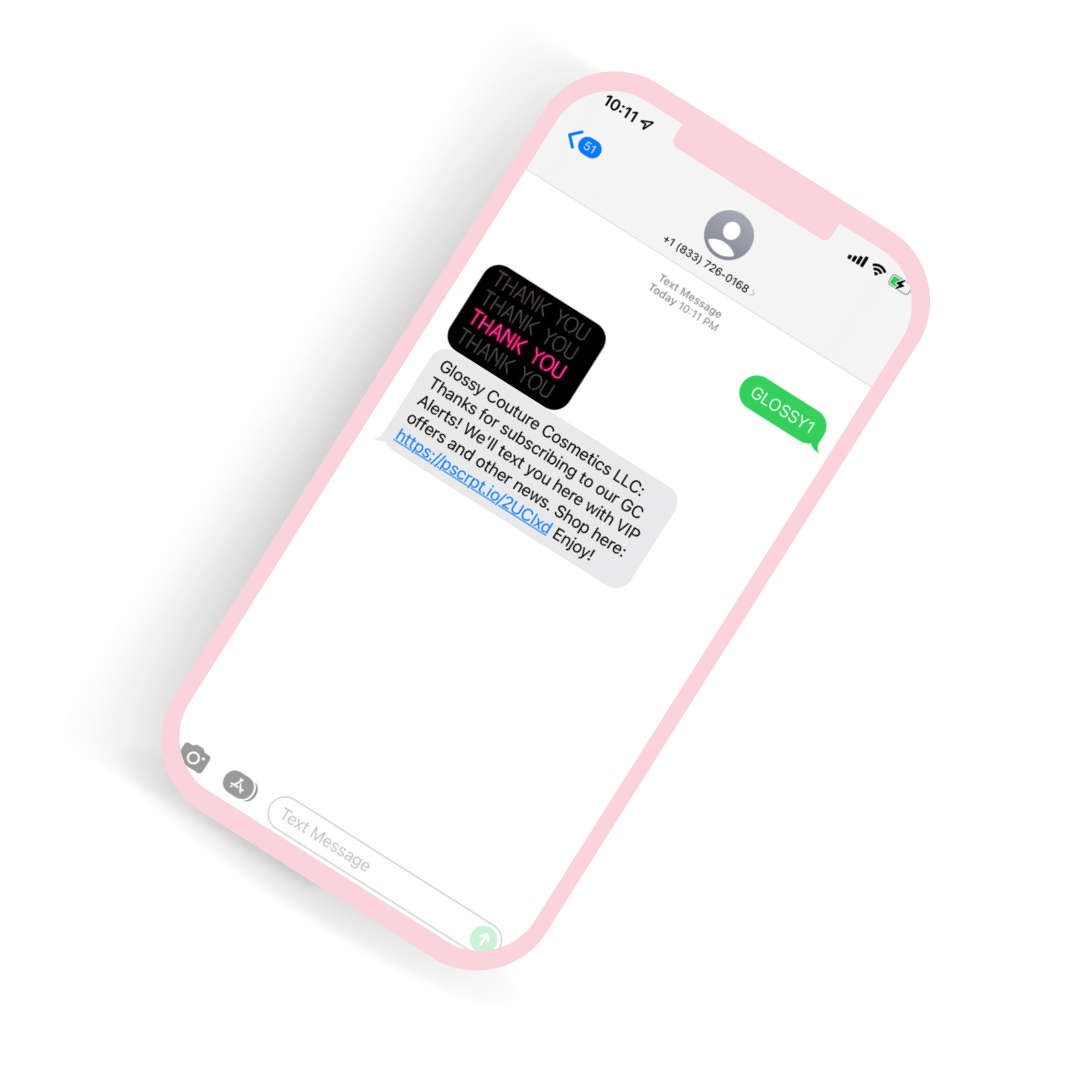Don't check your email often? Sign up to recieve our text messages! Signing up will get you exclusive offers and other news directly to your phone. Text GLOSSY1 to (833)-726-0168. Never miss an update again. ♡